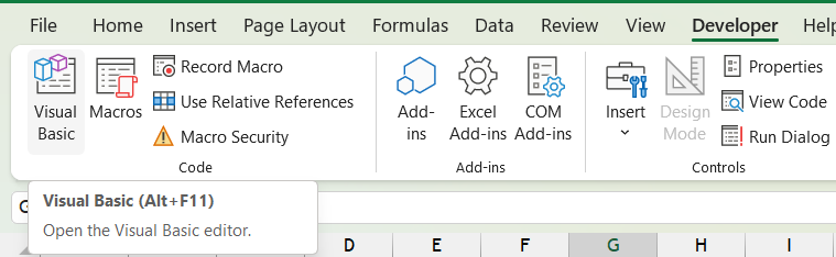 Open Visual Basic Editor (or) press Alt + F11 [Navigate to Developer tab » Code group » Visual Basic]