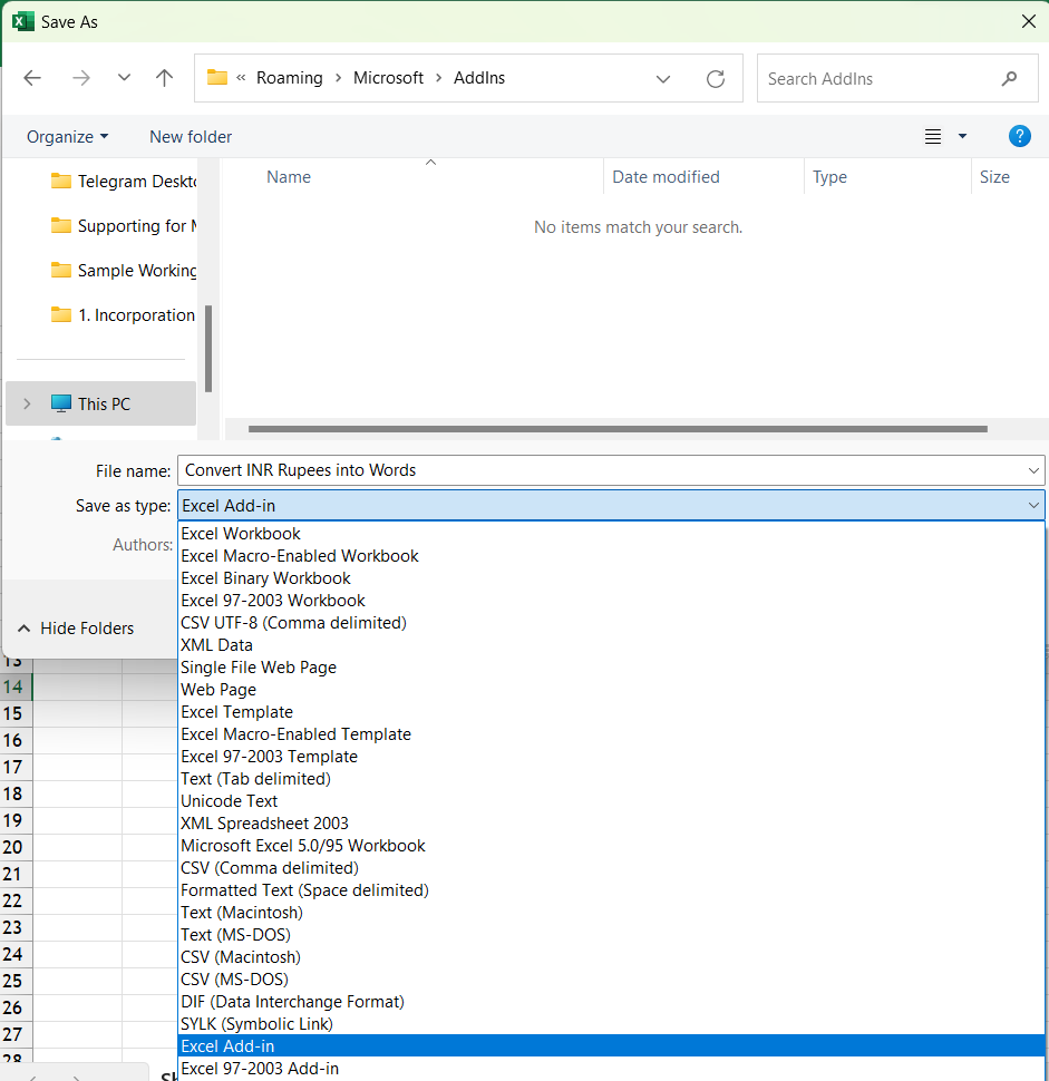 Press F12, Name the file as you wish “Convert INR Rupees into Words”, select “Excel Add-in” in save as Type and save the file.