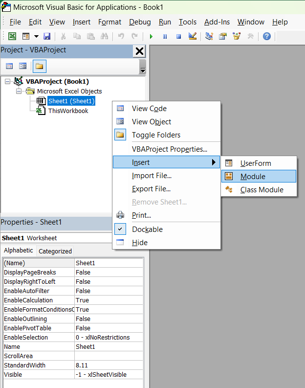 Right-click on ThisWorkbook in the left corner » Insert » Module