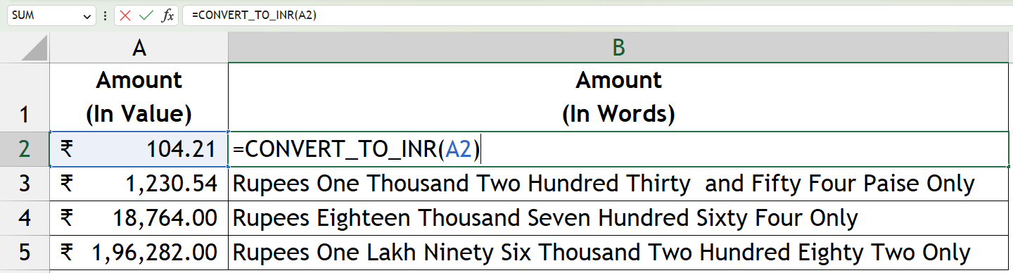 Now type an amount in any cell and use the function called “=CONVERT_TO_INR”