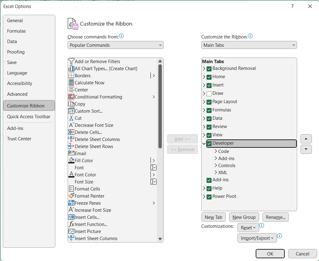 Navigate to the File tab » Options » Customize Ribbon » Tick (or) enable the Developer Tab