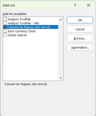 Navigate to Excel Add-ins, tick the “convert INR Rupees into words” in Add-ins pop-up window and press OK.
