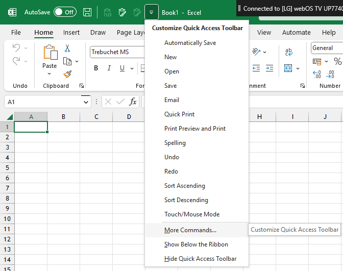 Tap the Dropdown icon in the Quick Access Toolbar >> More Commands