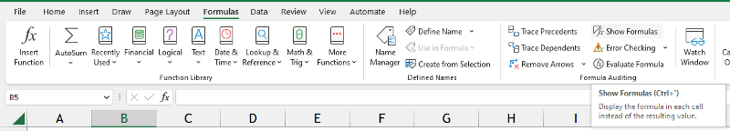 Navigation: Formulas Tab >> Show Formulas;