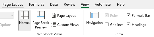 There are three types of Views in which workbook content can be displayed and modified (available in the Status Bar of the workbook or View Tab >> Workbook Views; Shortcut: Alt, W):