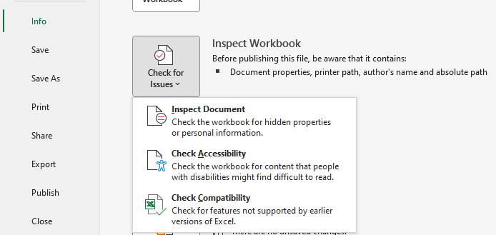 Navigation: File >> Info >> Inspect Workbook >> Check for Issues;