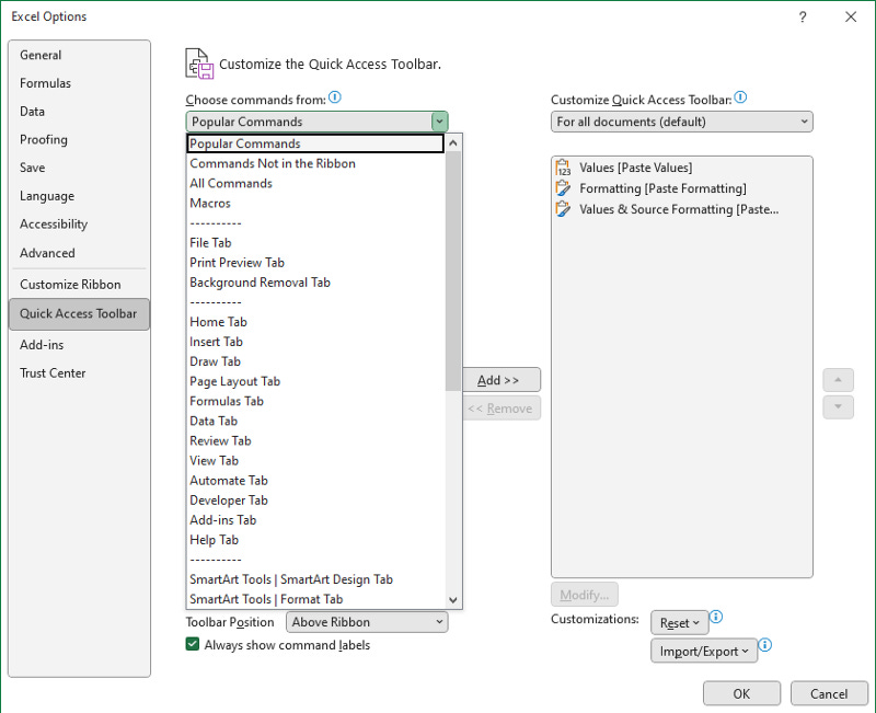 Files >> Options >> Quick Access Toolbar; Shortcut: Alt, F, T